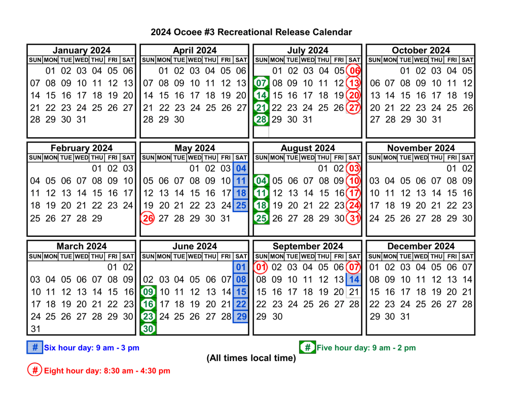 Ocoee #2 indicates the Ocoee Dam #2, which controls river water releases for the popular Middle Ocoee River rafting section. Note: The Middle Ocoee River has releases 5 days a week during June through Labor Day. The river is NOT running on Tuesdays and Wednesdays.This means TVA is NOT releasing enough water to go rafting or boating. For spring (March and April) and fall (September and October), the Middle Ocoee runs on the weekends only. The last week in September is always the “Week of Water” and the river runs every day for that week only.
