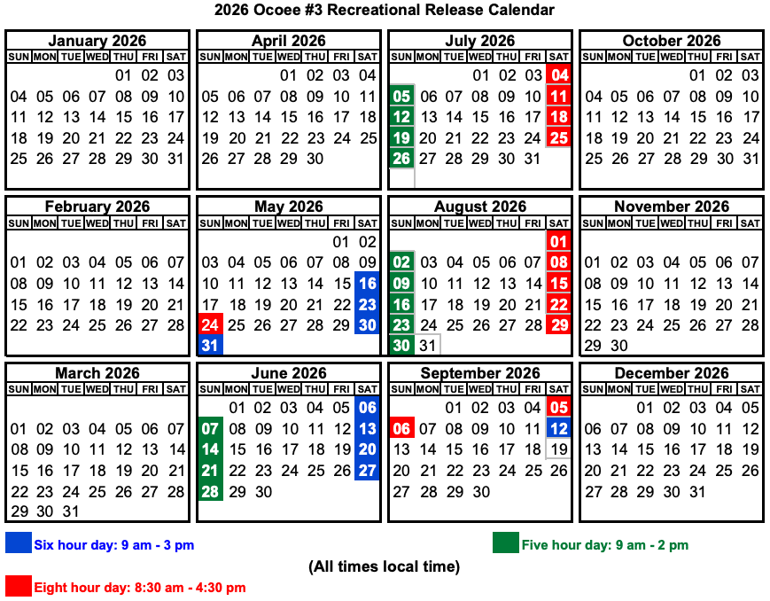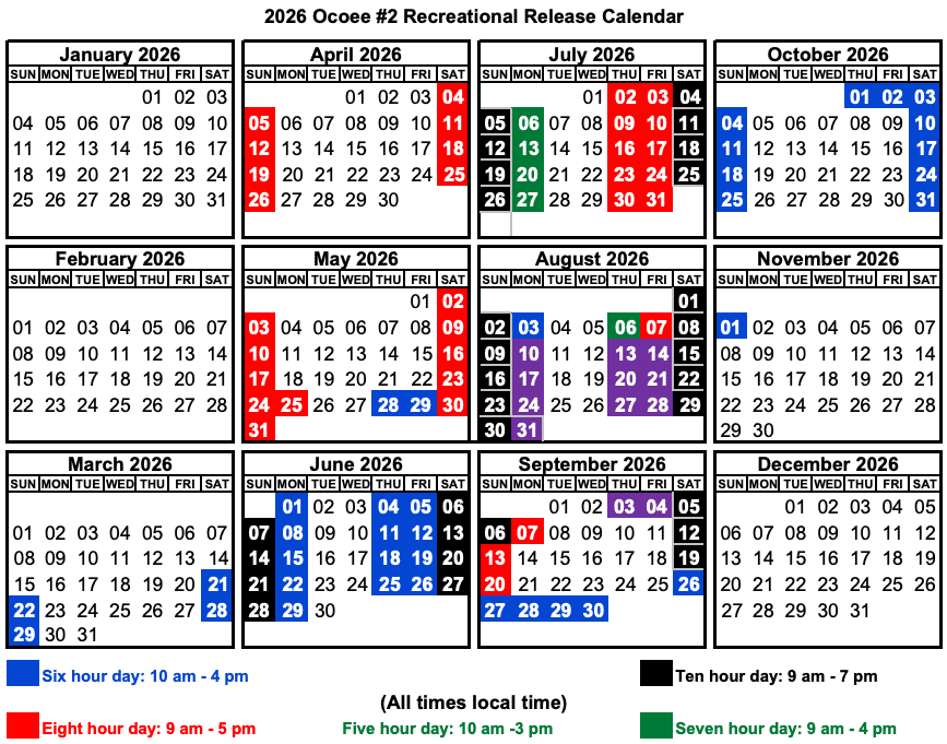 The Ocoee River is controlled by three dams – Ocoee Dam #1 (Lower Ocoee), Dam #2 (Middle Ocoee) operated by the Tennessee Valley Authority (TVA). The TVA controls when and which dams release water that enables whitewater rafting and private boating for the public. Note that the TVA Release Schedules can change without notice due to unanticipated weather changes or power system requirements. See the 2026 Ocoee River release schedules below.
